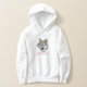 A camisola com capuz é mostrada em branco. Mangas compridas, bolsos de canguru e golpes de pull-over com a frase de "Yellowstone" escrita em rico, a rosa, e completada por um gráfico de cabeça de lobo.