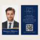 Cartões de visitas de borda curvos modernos, verticais, azuis escuros e ouros (gradiente de cor impresso, não folha real) com seu nome e título nos campos de modelo frontal e personalizável para suas informações de contato, logotipo e código QR no verso. Você pode alterar as cores de fundo e fonte, mover e redimensionar elementos com a ferramenta design.