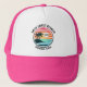 Boné de caminhoneiro personalizado divertido para comemorar suas férias tropicais, reunião familiar, despedida de solteiro ou despedida de solteira, etc. Características cena de praia vibrante com palmeiras. Uma maneira perfeita de comemorar aquela viagem ou festa incrível. Personalize o nome da viagem/evento/família, local e ano.