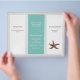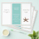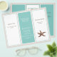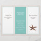 Modelo de folheto de negócios tri-fold nas cores azul-turquesa, branco e bege com estrelas-do-mar. Personalize seis painéis, três de cada lado, em papel de folheto acessível. Forneça informações sobre o negócio ou serviço, com um espaço para uma seção "sobre" que inclui uma selfie. As estrelas-do-mar marrons podem ser substituídas por um logotipo. Os painéis alternam entre branco com texto marrom-escuro e azul-turquesa com texto branco. Inclua horário de funcionamento, localização da empresa e muitas outras informações sobre os serviços. O papel de 21,59 x 27,94 cm será dobrado pelo comprador. Verifique todo o texto quanto à precisão, pois nenhuma revisão será feita antes do envio.