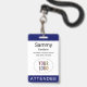 Personalize nosso crachá de participante profissional com o logotipo do evento, o nome do participante e outro texto personalizado. É plástico pvc e disponível com um jardim, clipe ou um rolo retrátil. Projetado em azul escuro e outras cores com uma design moderna minimalista pela MISOOK. Todas as cores são personalizáveis. Você pode, opcionalmente, adicionar outro conteúdo ao verso (código QR, termos etc.). Personalize facilmente o título do participante (convidado VIP, visitante, auto-falante etc.). Nenhuma quantidade mínima de ordem e nenhuma taxa de configuração.