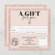 Um certificado de presente quadrado simples, cor-de-rosa, cor-de-rosa, cor-de-rosa moderno, com brilho rosa, adicione o seu logótipo, com um coração rosa dourado. Um vale perfeito de aniversário ou de presente de Natal.