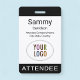 Personalize nosso crachá de evento profissional de participante com seu logotipo, nome de participante e outro texto personalizado. É plástico pvc e disponível com um jardim, clipe ou um rolo retrátil. Projetado em preto e outras cores com uma design moderna minimalista pela MISOOK. Todas as cores são personalizáveis. Você pode, opcionalmente, adicionar outro conteúdo ao verso (código QR, termos etc.). Personalize facilmente o título do participante (convidado VIP, visitante, auto-falante etc.). Nenhuma quantidade mínima de ordem e nenhuma taxa de configuração. Todas as encomendas são satisfeitas pela Zazzle em produtos do Zazzle. O MISOOK NÃO tem suas informações de personalização, envio ou cartão de crédito, portanto entre em contato diretamente com a Zazzle para fazer perguntas, inclusive sobre como personalizar seu design.