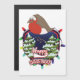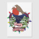 logotipo do Robin desenho animado Feliz Natal com um robin, texto vintage, luzes de Natal e árvores cobertas de neve.