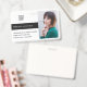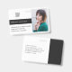 Crachá de identificação preto e branco clássico com foto e logotipo na frente e endereço de retorno se perdido na parte traseira do crachá. Este item profissional também inclui a localização comercial, o título do cargo e o número de identificação do funcionário, e um simples design de blocos de cores preto e branco.