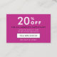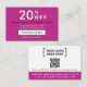 Este simples cartão de desconto de cupão moderno tem um design magenta minimalista, preto e branco e um texto simples personalizável. No verso, você pode encontrar um código QR personalizável e um logotipo para substituí-lo pelo seu próprio. Perfeito para descontos em eventos esportivos, ou outro tipo de ofertas de promocional, para ajudá-lo a promover sua empresa.