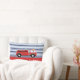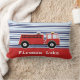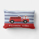 A almofada personalizada deste rapaz apresenta um motor de incêndio giro num fundo vermelho com metade superior azul e branca listrada. A imagem tem uma linha branca de contorno à sua volta para ajudar a separá-la do fundo. Está pronto para ser personalizado e é adequado para o transporte de um garoto do quarto temático de caminhão de incêndio ou para um garoto que gosta de motores de incêndio.