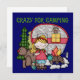 Meninas que adoram acampar adorarão este design de exterior fofo com uma garota loira de cabelos em férias de acampamento, um urso, coruja, campista, árvores e fogo no acampamento!