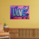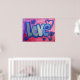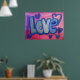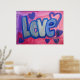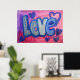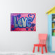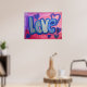 Pintura da palavra "Amor" em azul-doce de algodão contra fundo cor-de-rosa e bolha roxa. Corações roxos e azuis dançam ao redor das letras. Há uma camada clara de brilho azul e prateado sobre o topo. Você pode personalizar este poster de arte amorosa com o botão "Personalizar". Adicione seu próprio texto e imagens para um presente de amor personalizado!