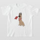 This is a simple yet fun t-shirt which has a hand-drawn illustration of a cute brown-and-black dog wearing a bandana with many hearts on it and is holding a flag in its mouth that says, "Love You."