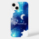 Um relógio de galáxia azul com estrelas e uma lua crescente pendurada. Em cores azuis, brancas e lacrimejantes. Uma visão elegante do espaço cósmico.