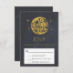 Um cartão de RSVP de casamento. Design de tipografia adorável e romântica com lua crescente e estrelas douradas sobre fundo negro de quadro negro. O texto diz que te amo na lua e de volta, escrito em uma fonte caprichosa e peculiar.