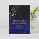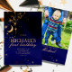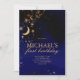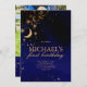 Lua e estrelas no primeiro convite de aniversário. Cor azul real, preto e dourado. Uma perfeita festa de aniversário de lua cósmica e estrelas. Para personalização mais avançada deste design, basta selecionar o botão "Personalizar o computador" acima! Também disponível como download para sua conveniência.