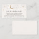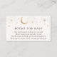 Um cartão de inserção de solicitação de livro para o chá de fraldas. Com luas e estrelas e poema: "UMA PEQUENA SOLICITAÇÃO, ESPERAMOS NÃO MUITO DURO POR FAVOR TRAZER UM LIVRO EM VEZ DE UM CARTÃO QUE ELES CHERARÃO O LIVRO, BEM AMADO OU MARCA NOVO, ASSINE O DENTRO COM UMA MENSAGEM DE VOCÊ!"