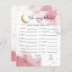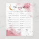 Um cartão de jogo "quem é a minha mãe?" com chá de fraldas de cor d'água, cor de rosa, com lua de ouro falsa e estrelas. Combine o nome do bebê com as mães corretas! Quem tem mais nomes, acerta, ganha! CHAVES DE RESPOSTA: 1.GOOSE=GOSLING, 2.DEER=FAWN, 3.SWAN=CYGNET, 4.ZEBRA=FOAL, 5.KOALA=JOEY, 6.SEAL=PUP, 7.PANDA=CUB, 8.WHALE=CALF, 9.PIGEON=SQUAB, 10.ALLIGATOR=HATLING 11.GORILLA=CRIANÇA, 12.CAT=KITTEN, 13.TURQUIA=POULT, 14.GOAT=KID, 15.FISH=FRY, 16.LLAMA=CRIA