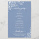 Estes programas de casamento são elegantes e saborosos, enquanto ainda são favoráveis ao orçamento. O design apresenta um padrão de local floral branco ornamentado em um fundo azul empoeirado ou colorido de piscar. A tipografia apresenta uma caligrafia antiga em script, e há espaço para detalhes sobre a cerimônia, a festa noiva e um obrigado curto para você.