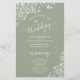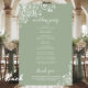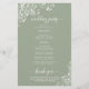 Estes programas de casamento são elegantes e saborosos, enquanto ainda são favoráveis ao orçamento. O design apresenta um padrão de renda floral branco ornamentado em um fundo verde sábio. A tipografia apresenta uma caligrafia antiga em script, e há espaço para detalhes sobre a cerimônia, a festa noiva e um obrigado curto para você.