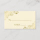 Estes bonitos cartões de escolta foram desenhados para ajudar os seus convidados a encontrar a mesa correta. Eles apresentam um design de gravação para que você preencha o nome do convidado e o número de sua mesa para facilitar a localização de seu assento. O fundo é uma cor de marfim ou creme com fraldas de folha de folhas douradas nos cantos. As costas têm os nomes do casal e da data do casamento.