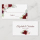 Estes elegantes cartões de identificação são projetados para você escrever o nome do seu convidado e o número da mesa. Eles apresentam um fundo branco clássico com rosas pintadas à mão em aquarela e folhagens em tons de borgonha, vermelho e rosa suave. A frente é um espaço para escrever o nome do convidado e o número da mesa, e o verso tem os nomes dos noivos em letras cursivas elegantes, juntamente com a data do casamento.