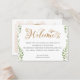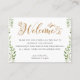 Este cartão para bolsa ou cesto de presente de boas-vindas para casamento com pintura em aquarela dourada e verde é ideal para uma celebração inspirada no estilo boho. Com folhas e eucalipto em verde escuro e sombrio pintados em aquarela, o design combina elegância rústica com um visual moderno de floresta.