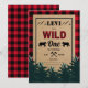 Celebre seu primeiro aniversário com esse convite personalizado de Lumberjack Primeiro Aniversário, Wild One. Apresentando uma xadrez de búfalo vermelha e preta e papel kraft com silhuetas de urso e machado.