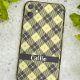 Padrão de verificação da diagonal "lumberjack" preto e amarelo pastel com cobertura de grade de ouro mate. Texto personalizável em letra branca moderna nesta capa de telefone personalizada.