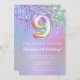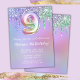 O convite de aniversário 9º, cor-de-rosa púrpura, pinga o 9º convite de aniversário para uma menina de 9 anos com escrevendo moderno de escrita e balões de folha divertida.