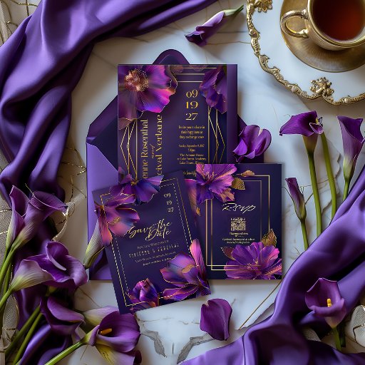 Simplify guest responses with elegance using the Luminous Violets QR Code RSVP Card, a modern wedding enclosure designed for seamless digital replies. Featuring luminous violet florals, a rich twilight background, and refined gold framing, this sophisticated RSVP card blends luxury design with contemporary convenience.
