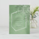 Uma paleta de cores de tendência em tons de chá macio e musgo a verde-caçador escuro; quadros geométricos cintilantes e layouts elegantes de design, fornecem a base para esta maravilhosa suíte de casamento. Quer você esteja planejando um casamento de destino ou ficando perto de casa, este delicado conjunto de design de folha de palma faz uma escolha atraente. O cartão "Convite" do casamento mostrado aqui também apresenta um padrão uniforme de folha de palma no verso. É fornecido um modelo para adicionar todos os detalhes do evento. Procure ID956 para ver outras peças e opções de cor para este conjunto.