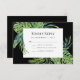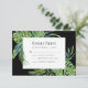 Este design apresenta folhagem tropical aquosa, incluindo luxuosa, monstera verde e palmeiras, circundando um quadro branco retangular sobre fundo preto. Personalize-o com a sua escolha de texto em fontes de sans serif pretas. O reverso é preto sólido.