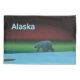 Um urso polar vagueia o gelo durante a longa noite polar; o Norte brilha em vermelho e verde à distância. A leitura de texto "Alaska" em azul e branco brilhantes também é exibida.