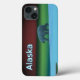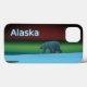 Um urso polar vagueia o gelo durante a longa noite polar; o Norte brilha em vermelho e verde à distância. A leitura de texto "Alaska" em azul e branco brilhantes também é exibida.
