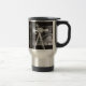 A caneca de viagem de aço inoxidável com um tema do filme de filme é uma grande ideia do presente para um lustre do estudante, do diretor, do ator ou do filme do filme. Silhueta branca da câmera do filme contra um grunge que olha fundo preto e cinzento com um carretel do filme.