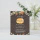 Este convite de Luzes de Corda de Abóbora de Outono de Orçamento apresenta flores azuis rústicas em flor no outono, pinhas, folhas laranjas e bagas, árvores de pinheiro, com uma pequena abóbora brilhante e luzes de corda. Personalize-o e aproveite.