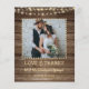 Um cartão de agradecimento de foto de casamento rústico e econômico impresso em papel semi-brilhante leve de 110 lb de 4,5x5,6 polegadas em vez de cartão, apresentando tábuas de madeira castanha envelhecida pelo tempo e luzes de corda com brilho amarelo suave, juntamente com o título de AMOR & AGRADECIMENTO e a data do seu casamento em uma fonte country western impressa à mão e seu nome em uma tipografia de pincel manuscrito. O verso do cartão apresenta o mesmo fundo de tábua de madeira e oferece um local para digitar uma mensagem de agradecimento pré-impressa (ou excluir o texto de exemplo para deixar em branco para escrever notas pessoais de agradecimento à mão). Ideal para orçamentos conservadores e/ou entrega pessoal a amigos e familiares. ADICIONE ENVELOPES na página de pedido, se desejar. ASSISTÊNCIA: Para obter ajuda com modificação de design ou personalização, transferência do design para outro estilo de cartão ou outro produto, ou se você gostaria de itens coordenados, entre em contato com o designer ANTES