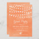 Convite de formatura divertida e caprichosa com luzes de cordas brancas sobre fundo de cor laranja rústica. Outras cores estão disponíveis.