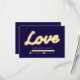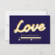 O amor escrito em iluminação de letreiro em um fundo azul escuro dá a este RSVP um brilho e glamour vintage. Role para baixo para ver a coleção completa de casamento. Se itens adicionais forem necessários para o seu evento, basta entrar em contato conosco em prettyfancyinvites@gmail.com com sua solicitação.