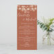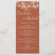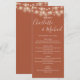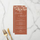 Elegante cartão de menu de casamento em terracota com lindas luzes em corda e nomes em estilo personalizado. Este cartão de menu moderno pode ser personalizado com suas informações em letras brancas elegantes. Criado por Thisisnotme©