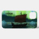 Uma imagem ligeiramente estilizada de um navio de longa distância Viking navegando à noite sob as Luzes do Norte ali um casal de icebergs; a maioria da tripulação está dormindo. A leitura de texto "VIKINGAR" (Vikings) também é exibida.