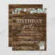 Convites de Aniversário Rústicos Country ao Ar Livre em Madeira Escura com Verde Eucalipto e Algodão com Jarras em Luz de Corda Primavera, Verão, Outono ou Outono - inclui tipografia de roteiro bonita e elegante para a celebração especial da Festa de Aniversário.