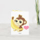Um macaco muito fofo e kawaii segurando uma banana, o fundo em tons amarelos e padrão de banana. em um cartão de agradecimento apropriado para um obrigado por vir ao aniversário, obrigado pelo presente do bebê / chá de bebê, etc.