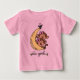 Dois adoráveis macacos com arcos cor-de-rosa e uma banana amarela com texto que diz "Gêmeas" em T-shirts gêmeas, carroças, canecas, cartões, autocolantes, selos postais e outras raparigas gêmeas roupa e presentes