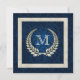 Pearl laurel wreath com moldura de pérola em um fundo azul-damasco rico.