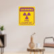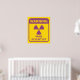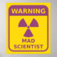 Aviso - Mad Scientist - poster de aviso humorístico em cores amarelas e roxas de sinais de aviso de radiação.