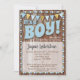 Um convite legal, rústico, azul e chá de fraldas de poca-dot dourado com um texto "É Um Rapaz!" no topo com fundo de madeira, bandeiras e uma bela borda poca-dot.