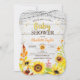 Todo o texto é editável, exceto o ouro "Bebê" Lindo girassol de aquarela sobre fundo de madeira rústica com confete de ouro. O verso é desenhado com uma pá e um lugar elegante. Convite perfeito especialmente para o outono!