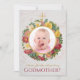 Proposta de madrinha para o batismo de uma menina Ela tem uma foto de menina marcante em uma coroa de rosas selvagens com uma cruz de ouro sobre ela. Sob a coroa de rosa, a mensagem da proposta da madrinha é escrita em uma escrita caligráfica elegante, exceto a palavra madrinha, que está em grandes bonés vermelhos. No verso, a mensagem é escrita no mesmo script caligráfico de ouro. O fundo de ambos os lados é mármore branco. A vintage florescente de rosas silvestres brancas, rosa, vermelhas e amarelas é do pintor e botânico belga Pierre-Joseph Redouté (1759-1840), do livro "Os Rosas" de Pierre Joseph Redouté e Claude Antoine Thory, publicado em 1817, agora no dominio público. A foto marcadora de uma menina de cor-de-rosa é de Vera Kratochvil do Dominio público Pictures e tem modelo de lançamento.