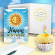 Faça sua mãe se sentir especial no seu aniversário enviando-lhe este sorridente sorriso decorativo Amarelo e laranja flutuando no céu azul com nuvens. O texto da dentro diz "O sol começou a brilhar um pouco mais brilhante no dia em que você estava nascer."