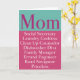 Aqui está uma lista divertida de trabalhos de Mãe. Ela é secretária social, deusa de lavanderia, conselheira de limpeza, mergulhadora de lavadora de louça, gerente da família, Engenheiro de Errand, Navegador rodoviário, mas acima de tudo ela não tem preço. Mostre seu apreço à sua mãe no Dia de as mães ou no aniversário dela.