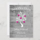 Personalize um anúncio de casamento único com uma Árvore Magenta de Corações Salve a Data. O design de lançamento apresenta um fundo de madeira de cinza enfeitado com uma árvore com corações florescentes nas suas galerias e texto que você pode personalizar com os detalhes da data do casamento. Salve ainda o anúncio de data disponível para este design em várias cores.